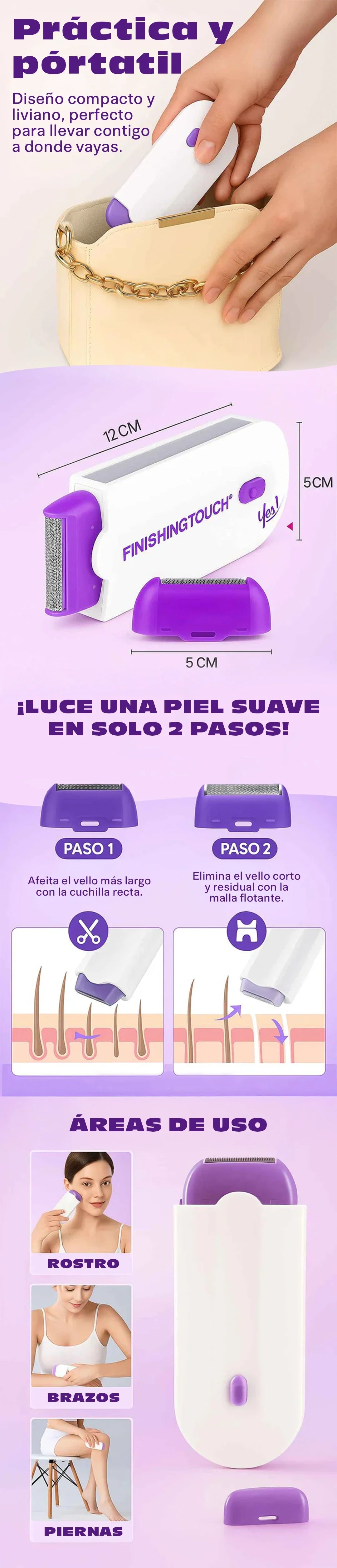 Su diseño portátil y tecnología de depilación suave eliminan el vello de forma eficaz, ayudando a dejar la piel más tersa, prolija y sin irritaciones, incluso en zonas sensibles.