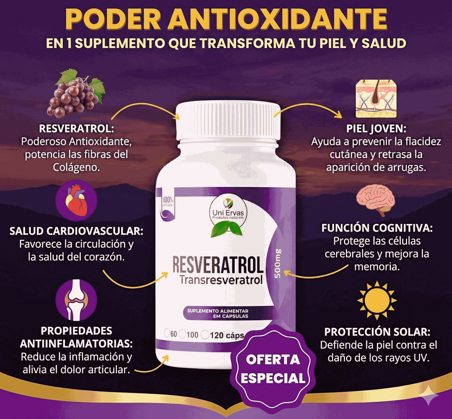 Está diseñado para apoyar el envejecimiento saludable, aumentar la protección antioxidante, promover la salud cardiovascular y mejorar la claridad mental — todo en un suplemento diario.